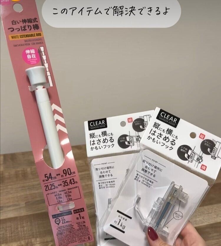 そこにダイソーの「白い伸縮式つっぱり棒50-70cm(φ10mm/13mm)」(110円)をのせるだけで、部屋干しスペースの完成!ダイソーには、ほかにも突っ張り棒の種類がたくさんあるので、ご希望の長さのものを使用してくださいね。