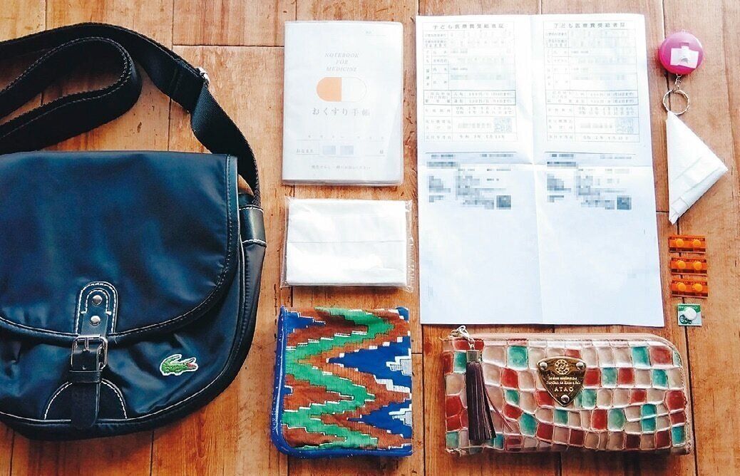 「外出時は、お薬手帳、子どもの保険証のコピー、常用薬、ポリ袋を持参。外出先での停電に備えて小型ライトも。災害時、荷物を持った状態でも子どもと手がつなげるように、斜め掛けのバッグを使っています」。