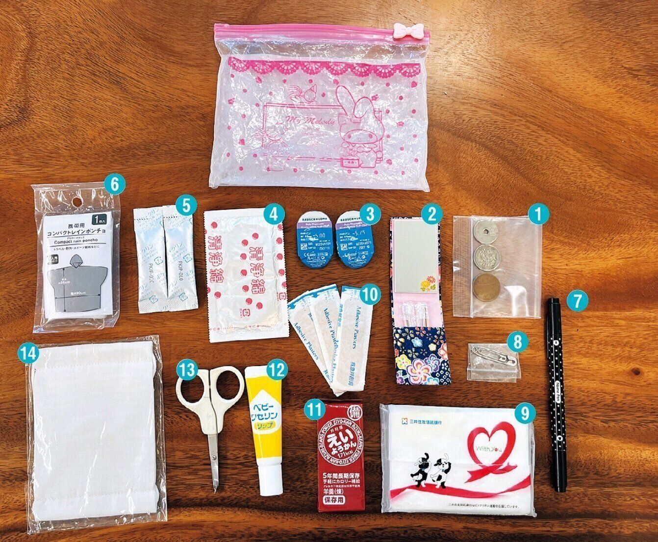 「元々使っていた普段使いのポーチに“災害が起きたときにあったら助かる物”を足して持参するように。中に入れる物は、防災系のYouTube動画を参考に。ポーチのほか、携帯用トイレ、生理用品もバッグに常備しています」。
