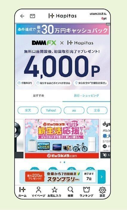 ネット通販で買い物するとき、このアプリを経由すると、各サイトのポイントがさらに稼げます。クレカやサブスクを申し込むときも、高いポイントが得られるので、ハピタス経由が必須です!