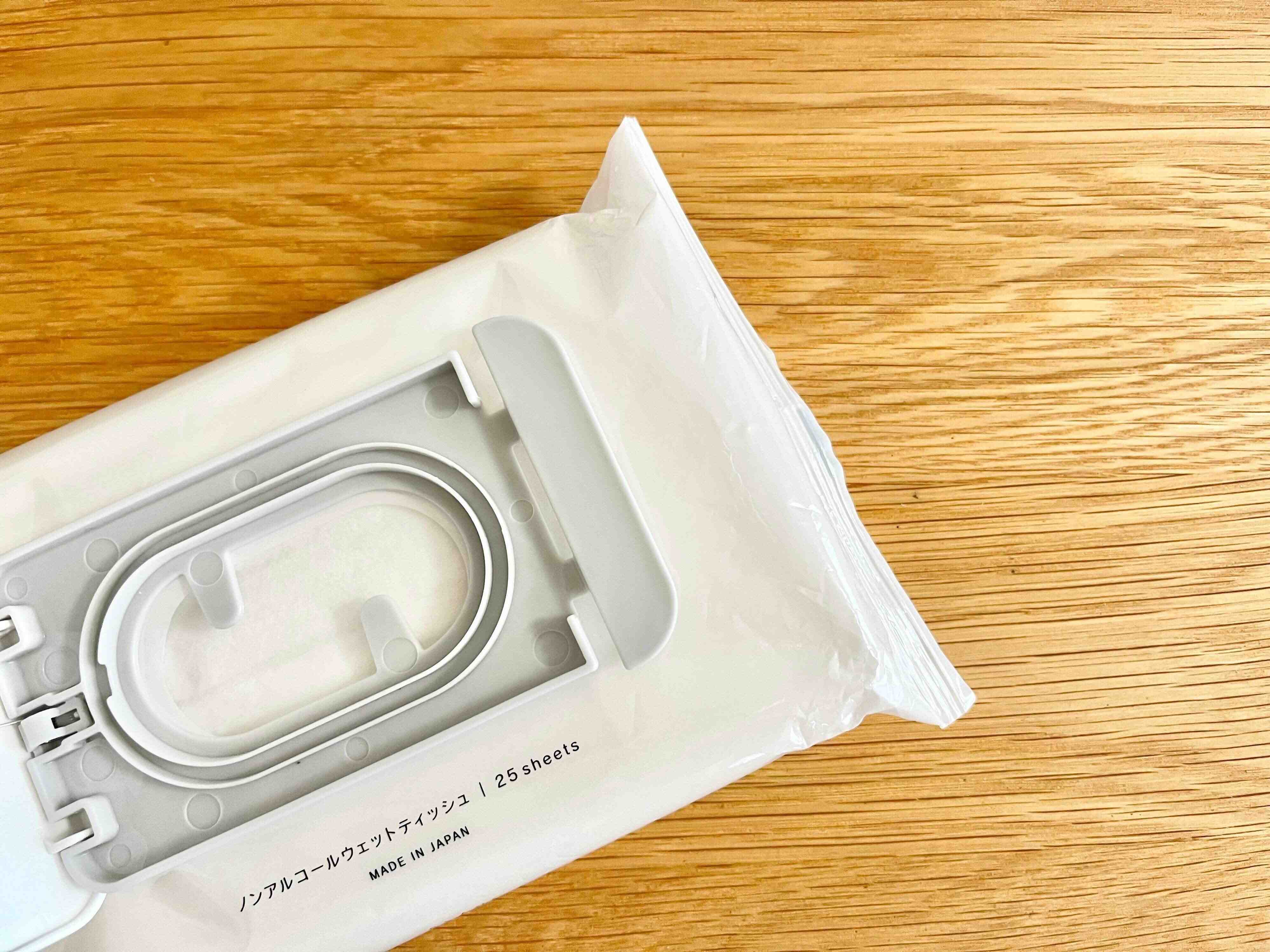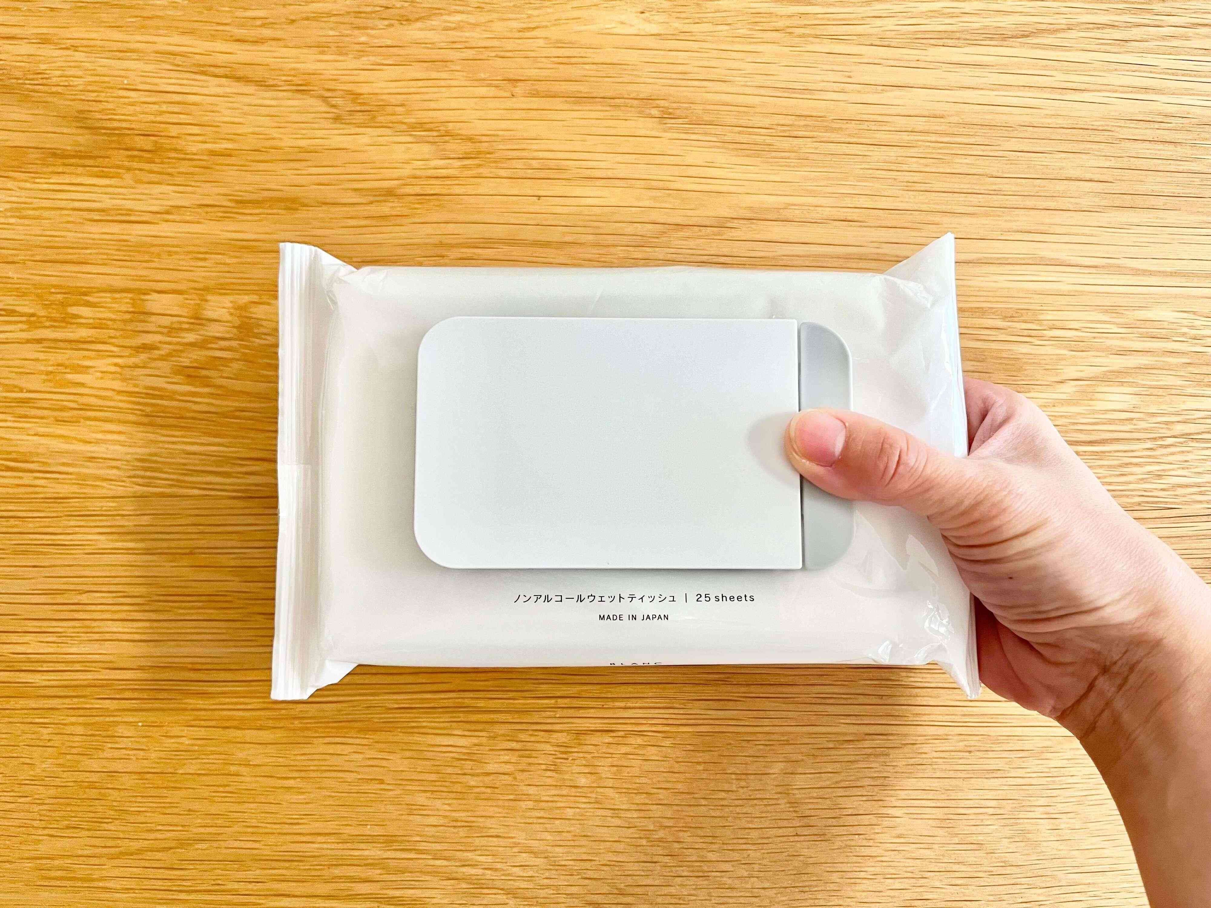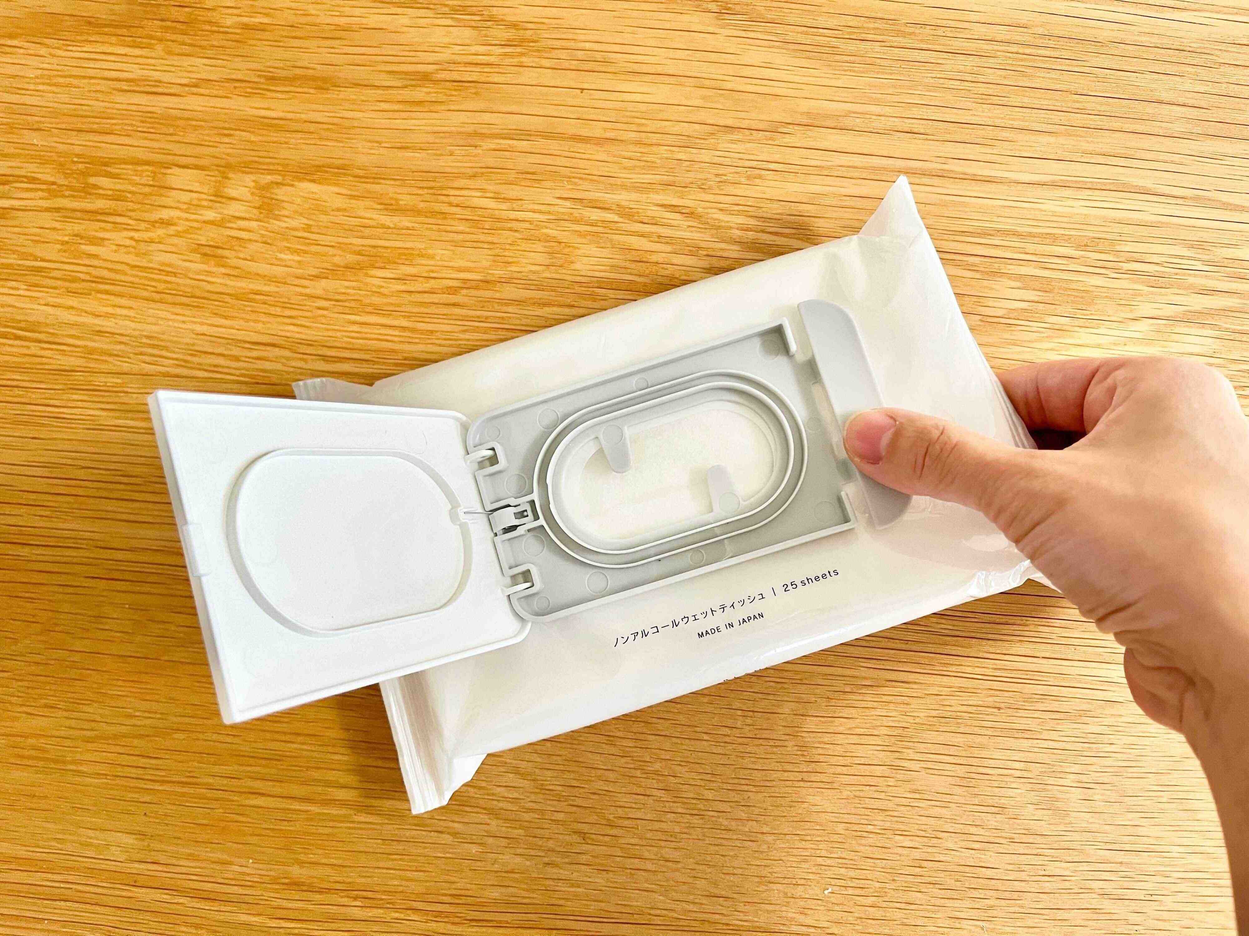 使い方は、ごく一般的なウェットシートのフタと一緒です。ちなみに、こちらは取り出し口が60mm×30mm以下のウェットシートに対応している商品なので、使用前に対応サイズをご確認くださいね。