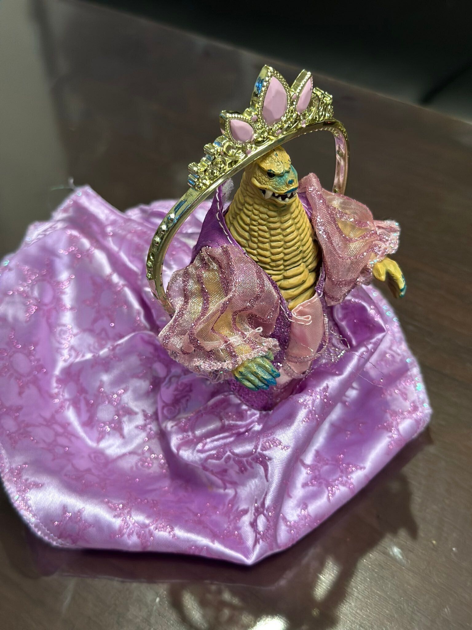 なんと娘さんは、怪獣にドレスを着せて、ティアラをつけたのです!
