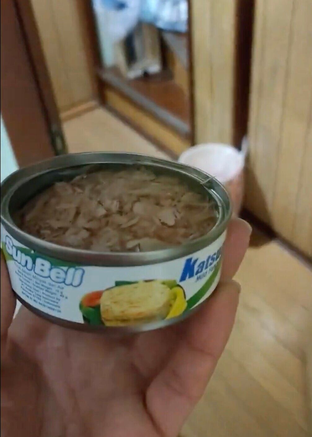 出張先のインドネシアで購入したという、カツオの缶詰を手に持っています。