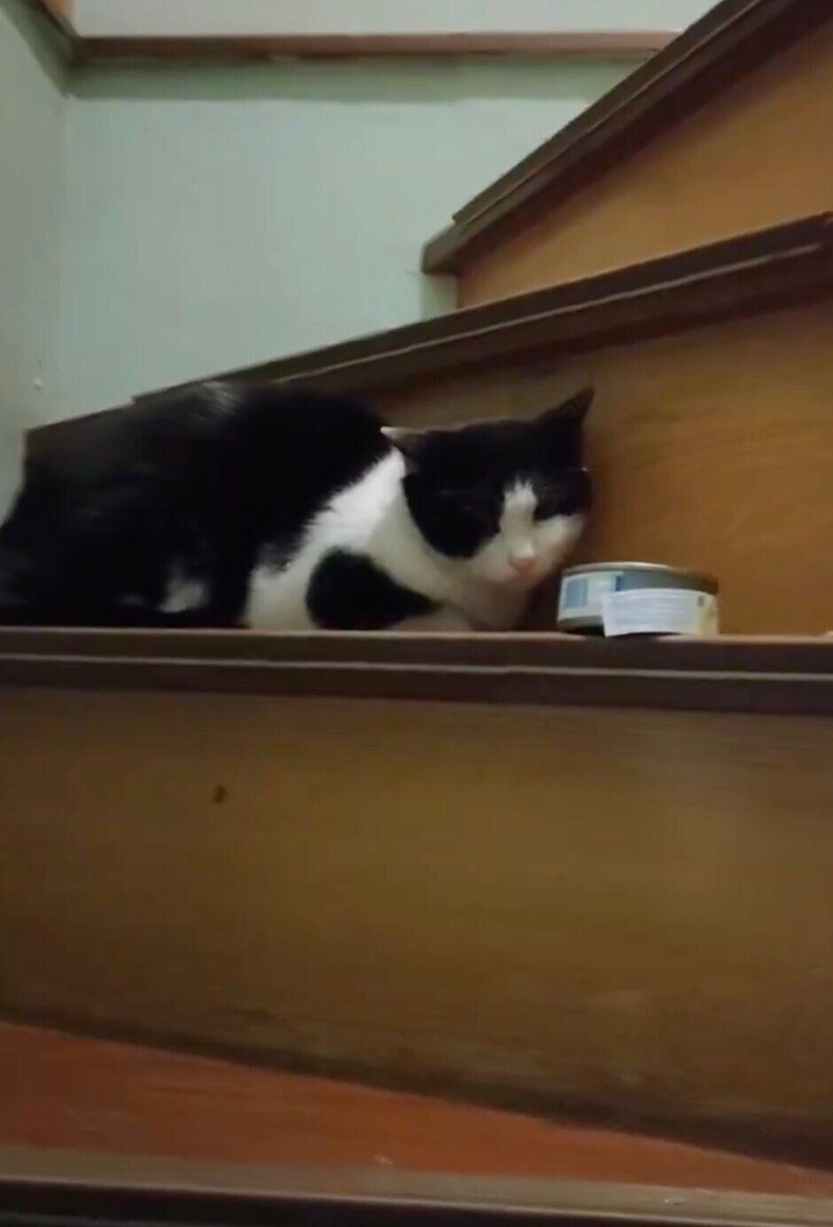階段から一向に動こうとしないにゃんこに、「寒いのかい?」とドリテンさんは優しく缶詰を差し出します。