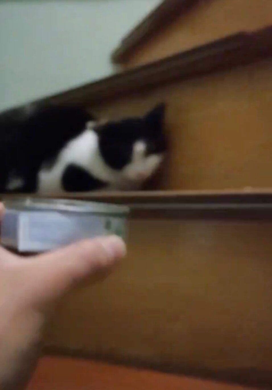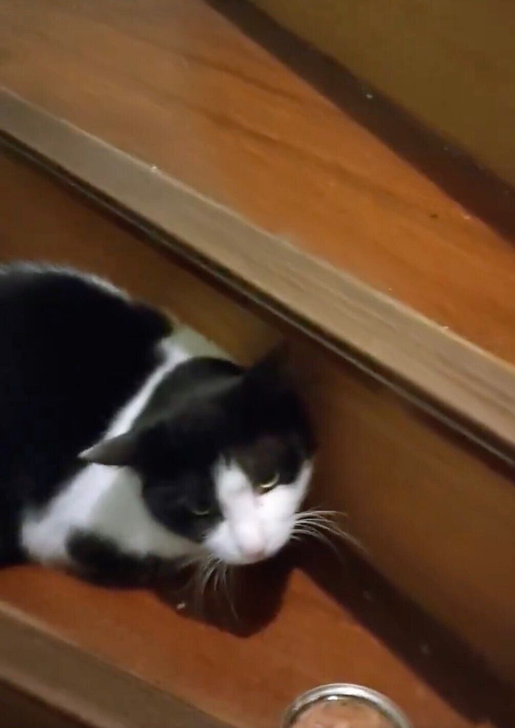階段が映し出されると、そこにいたのは、なんと見知らぬにゃんこ!