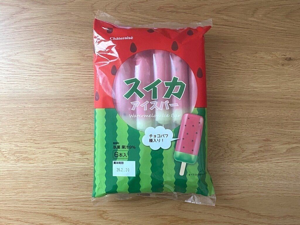 シャトレーゼのアイスコーナーで販売されている「スイカアイスバー」は、カットしたスイカをイメージした赤と緑のシャーベットに、種を模したチョコレートパフを混ぜ込んだバーアイス。果汁9%入りの氷菓で、夏にふさわしいさっぱりとした味わいを楽しむことができます。