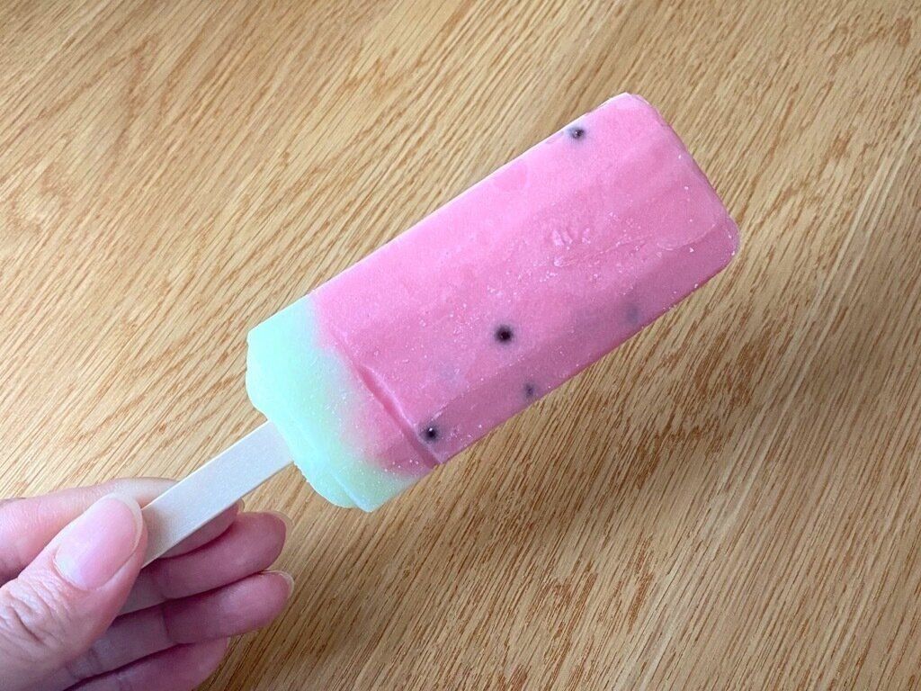スイカの皮をイメージした緑色のアイスの食感がサクサクと少しかためで、食感の違いも楽しめます。全体的にさっぱりとしていて、これからの暑い季節に欠かせないアイテムです。
