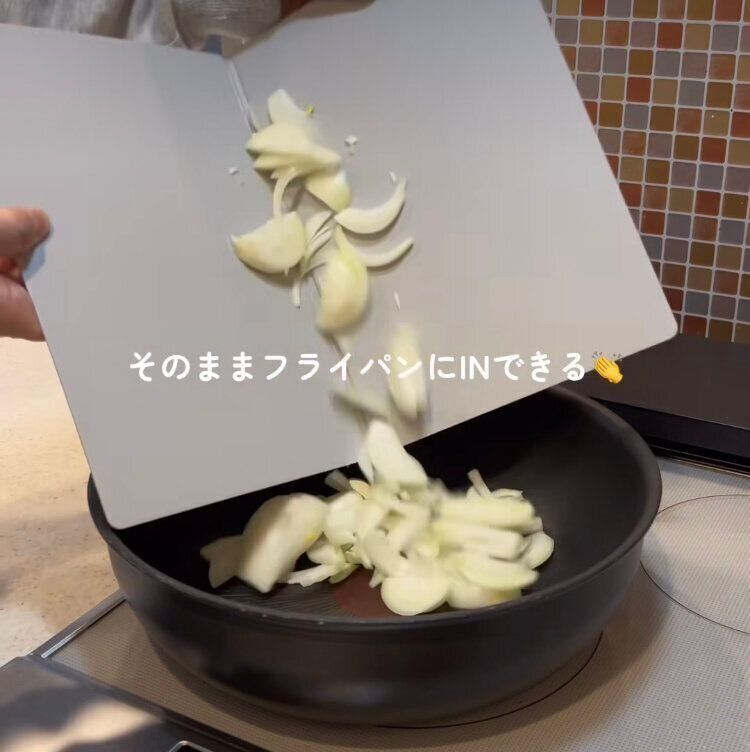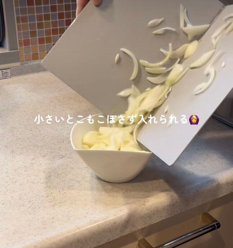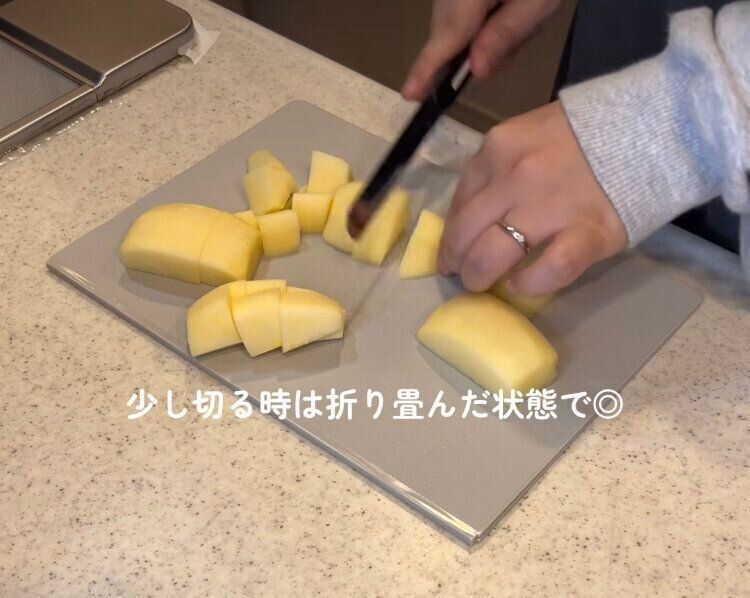 しかも、野菜を切ったあとは、そのまま鍋にIN。通常のまな板でももちろんできるのですが、このまな板の場合、少し折ることでこまかい野菜もこぼすことなく、鍋まで簡単に運んで入れることができます。まな板から直接入れようとして野菜がこぼれてしまうというストレスからも解放されますよ!