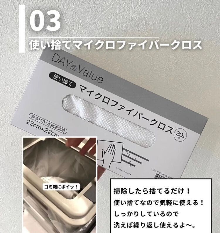 いつの間にか床が汚れていたり、ちょっとふき掃除をしたいと思ったときに便利なのが「繰り返し使えるマイクロファイバークロス2(20枚入)」399円です。