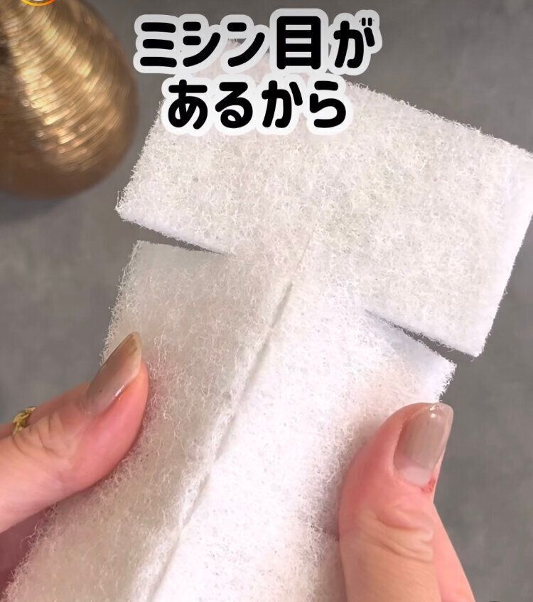 見た目はふつうのスポンジかと思いきや、スポンジに洗剤は含まれているので水にぬらすと泡立ち、そのまま食器を洗うことができるんです。さらに、切り込みが入っていて使いたい量だけ切りとって使用できるというのも助かりますね。