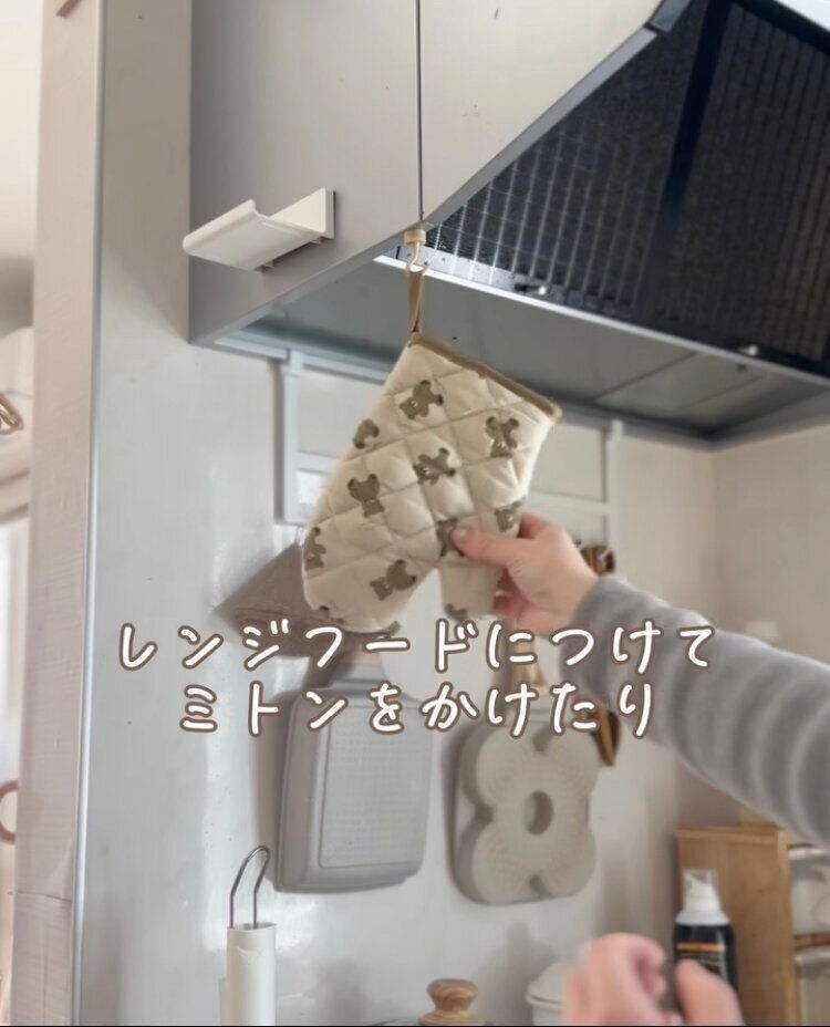 マグネットが使用できるところに簡単にフックを取り付けることができる「ネオジムマグネットフック」110円。マグネットなので、ものに穴を開けたり、接着剤が不要なのもうれしいポイント。キッチン周りでは、キッチン道具や軽い食材などをかけておくこともできるので便利ですね。他にも、冷蔵庫によく使うものをかけておくこともできますよ。よくあるシルバーではなく、落ち着いたトーンのベージュカラーなのも人気の理由です。