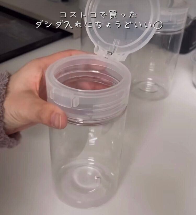 料理中などに、片手が塞がっている時に便利なのが、こちらの容器「ワンプッシュで開閉できる保存容器」。プッシュするだけで、ふたを開けることができるので、片手に菜箸を持って調理している時なども困りません。値段はもちろん、110円で購入することができます。透明なので、パッと見ただけで、残量がわかるのもいいですね。