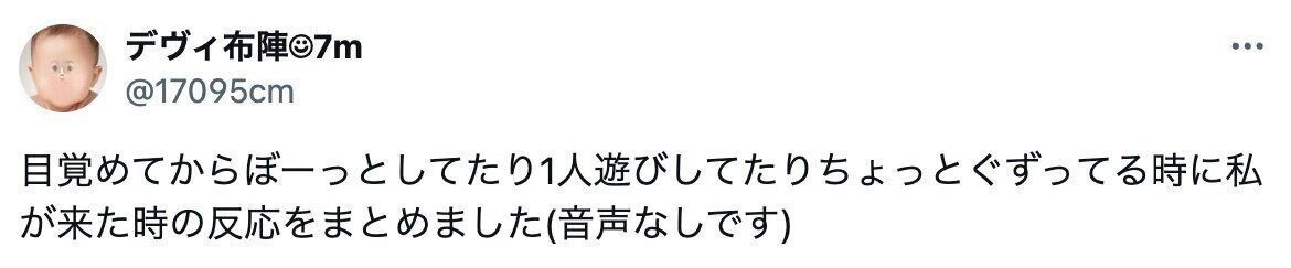 目覚めてからぼーっとしてたり1人遊びしてたりちょっとぐずってる時に私が来た時の反応をまとめました(音声なしです) pic.twitter.com/BLDfdKE3TS