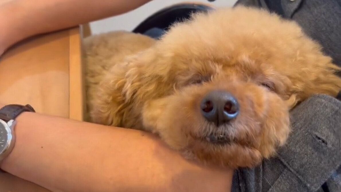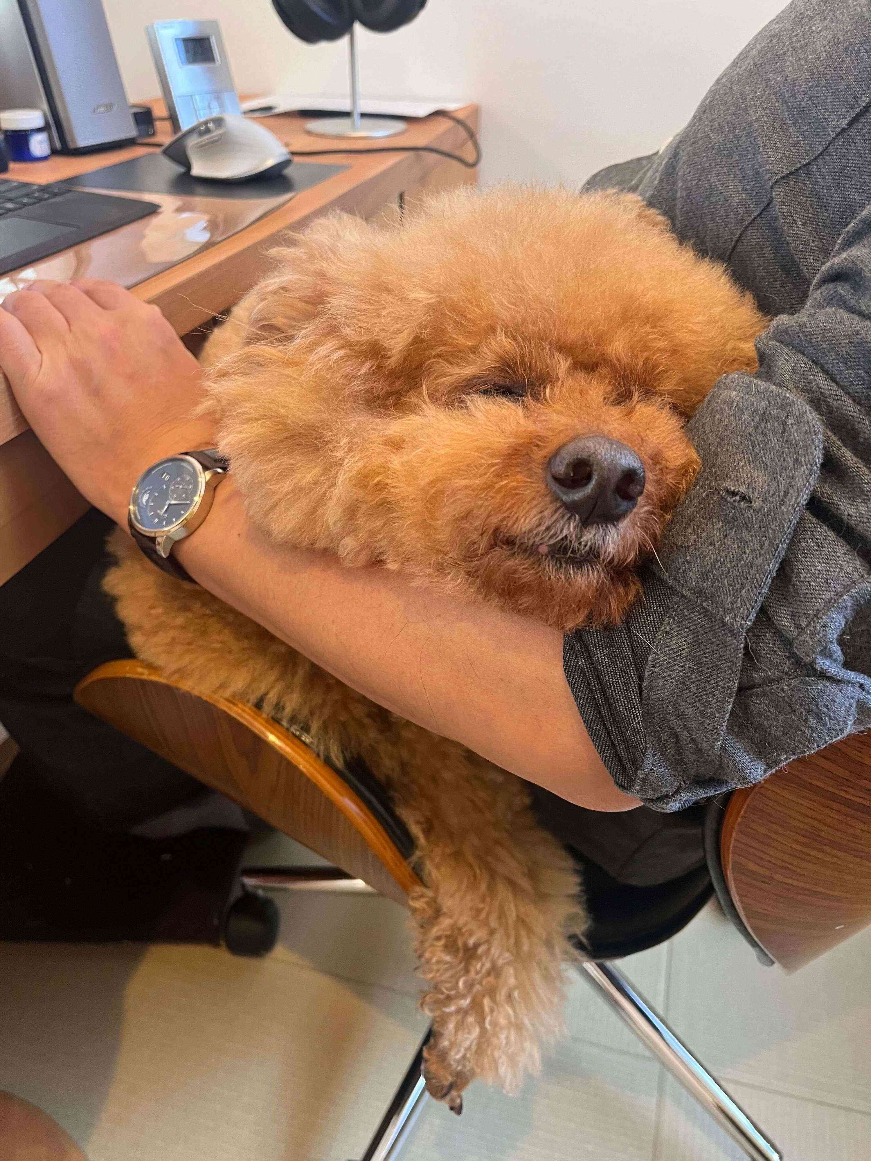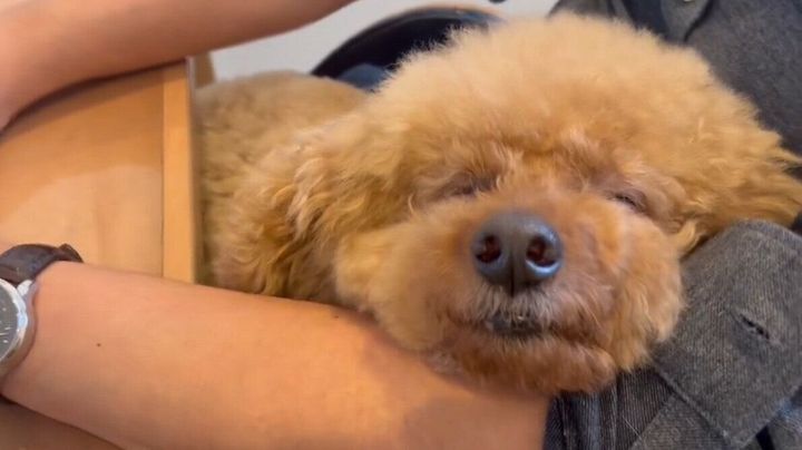 トイプードルPoochinとミヌエットKikiさん(@IW29WOXYx9SJanR)が愛犬・プーチンくんとの穏やかな時間を投稿しました。飼い主さんはリモートワーク中でしたが、抱っこをされたプーチンくんはとてもリラックスしていたようです。