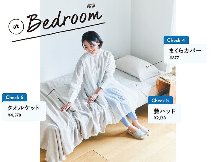 すべてトップバリュ ホームコーディの商品。「やわらか 綿 タオルケット」¥4,378、「速く乾くパイル生地使用 敷パッド」(シングル)¥2,178、「速く乾くパイル のびのびワンタッチシーツ」(SS~S)¥3,278、「速く乾くパイル のびのびまくらカバー」¥877、「ホテル仕様まくら」¥1,958、「サラッと竹コンフォートスリッパ」¥877 ※クレジットのない物はスタイリスト私物。