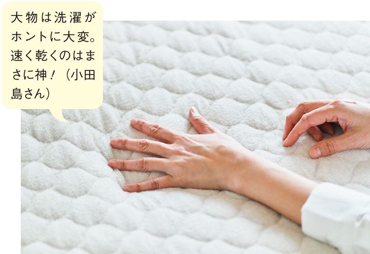 特殊な糸を使用することで、肌にあたる表面側はコットンを多めにしています。ここちよい寝心地をかなえながら、洗濯ネットを使えば洗濯機で洗えるし、速く乾くからお手入れがラク♪