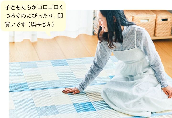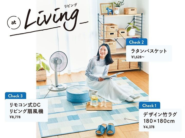 (上の写真)すべてトップバリュ ホームコーディの商品。「デザイン竹ラグ180×180cm」¥4,378、「竹スツールクッション」¥3,278、窓からの熱を防ぐ「花粉キャッチ・遮熱レースカーテン」(100×176cm・2枚組)¥2,728、「リモコン式DCリビング扇風機」¥8,778、「サラッと竹コンフォートスリッパ」¥877、「パッキン一体型ワンプッシュピッチャー 1.6L」¥987、「ティアドロップグラス」¥327、「マルチ収納ラック4段」¥19,580、「ラタンバスケット」各¥3,278 、「ラタンバスケット ハーフ」各¥2,178、「ラタンバスケット 縦ハーフ」¥2,178、「ラタンバスケット クォーター」各¥1,628、「ラタンふた」各¥1,078、「ラタンふた ハーフ」各¥657 ※クレジットのない物はスタイリスト私物。