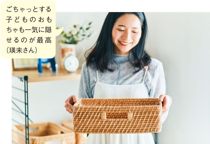 リビングが雑多に散らかっているとそれだけで暑苦しい気分に。天然素材のバスケットにポイポイ放り込んでしまうことで、スッキリ風通しのいい空間が完成します!