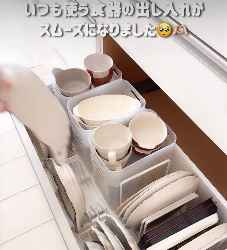 投稿者のかたのように横向きで使用したい場合は、しっかり後ろも安定させて倒れないようにしましょう。これを使うと、食器の出し入れがスムーズになるので嬉しいですね。