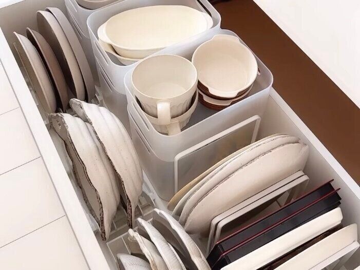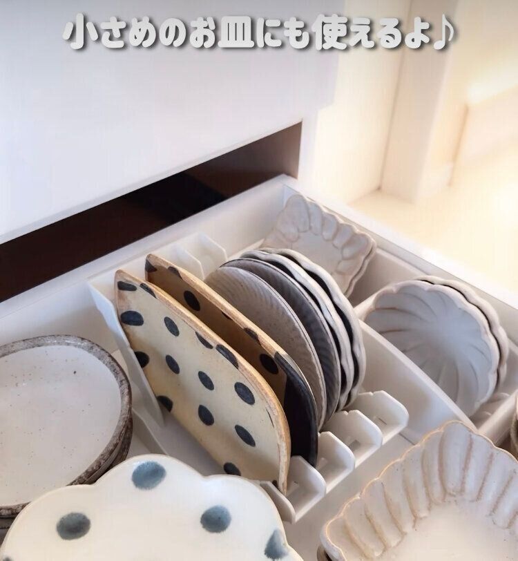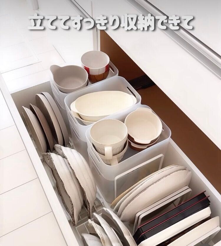 収納するにも場所を取ることも多く、積み重ねると上の同じものしか使わなくなるなど、悩むことが多いお皿の収納。そんな時の救世主が「プレートスタンド」(110円)。引き出しの中に入れて使用すると、お皿を立てて収納することができるんです!小さめのお皿や深めのお皿でも使用することができるので助かります。