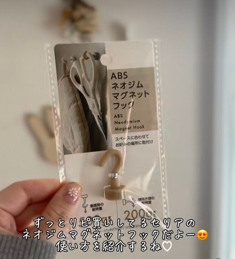 お次は、メモ用紙やプリントなどを貼ることもでき、さらにフックとしても使用できる優れもの「ネオジムマグネットフック」(110円)。リピ買いする愛用者もいるほどなので、相当使えるアイテムです。