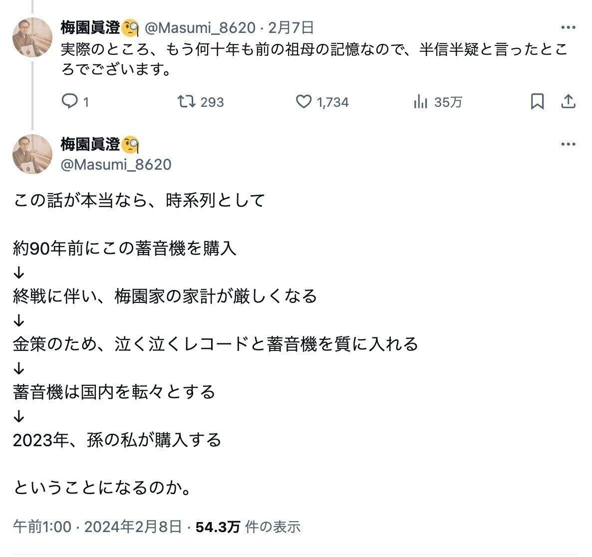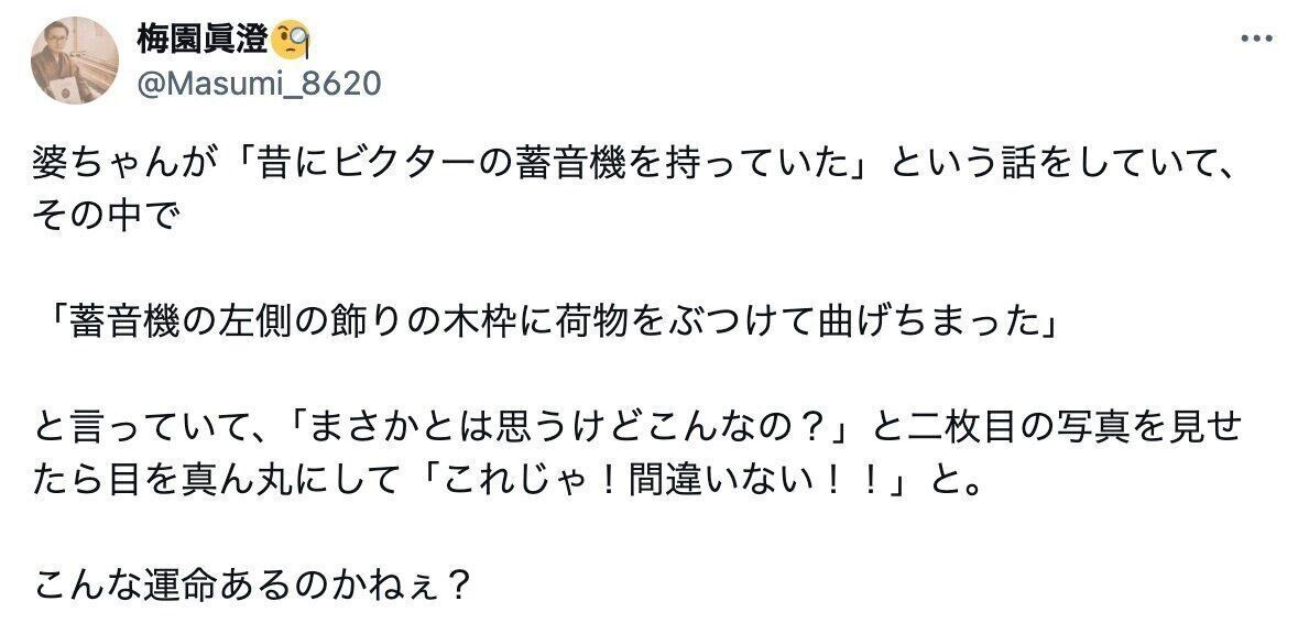 戦前の暮らしを求め、レトロなアイテムを集めている梅園眞澄さん(@Masumi_8620)。あるとき、フリマサイトで購入した蓄音機が、偶然にも昔おばあちゃんが愛用していたものと発覚!運命的な再会に「おかえりなさい」と2.1万人が感動しました。