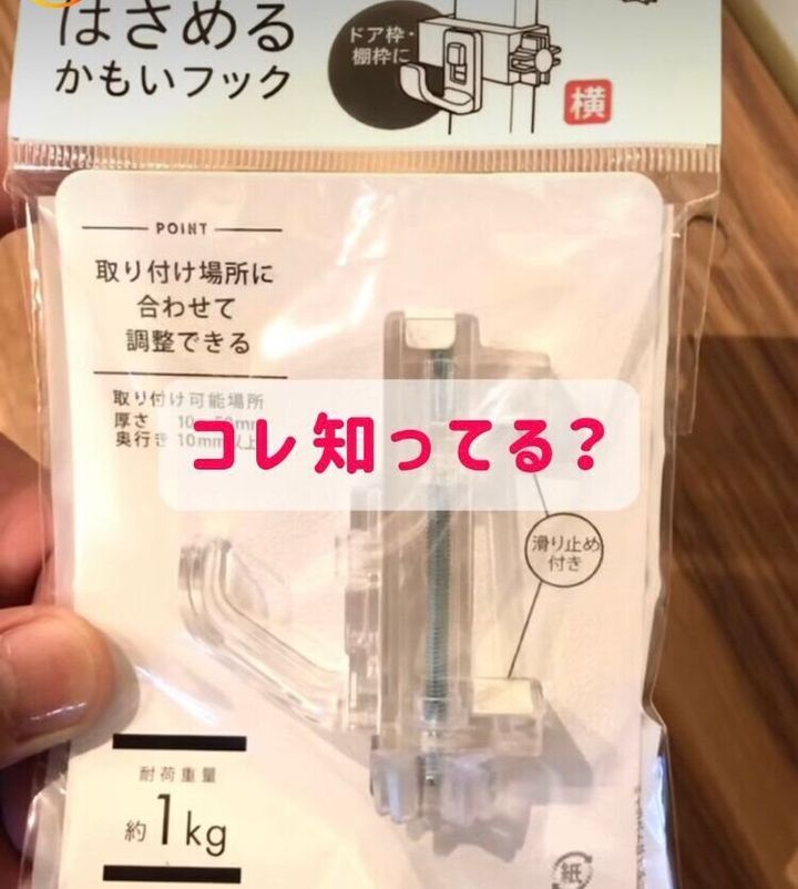 最後は、家中色々なところで使用できる「かもいフック」(110円)。これ一つあれば色々なところにフックをつけることができ、物をかけることができるようになります。耐荷重量も1kgなので用途はたくさんあります。このかもいフックの嬉しいところは、縦でも横でも使用することができること。これ一つを単体で利用して洋服や物をかけるフックとして使用することもできますし、突っ張り棒と一緒に使用すれば洗濯物を干す場所を作ることができます。