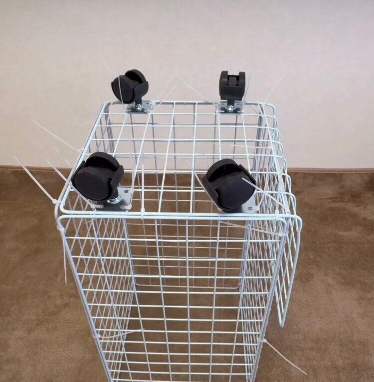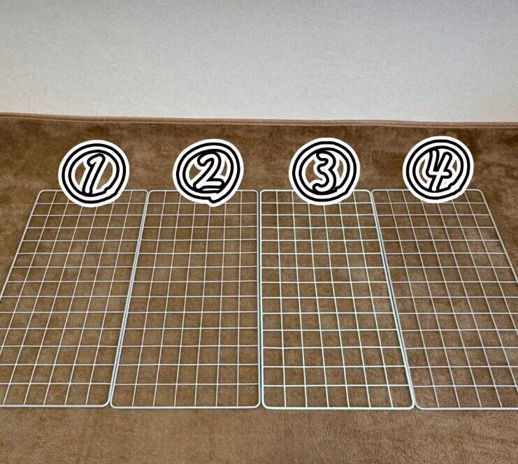 作り方はワイヤーネットを4つ繋げて結束バンドで固定。残りの1枚を底用にベッドなどの角を利用して折り曲げて、結束バンドで繋げる。この時に少しズレているのは、完成後はゴミ袋収納となるのでわざとなんです。
