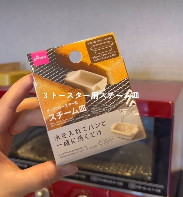 パン好きさんには絶対購入して欲しいアイテムが「オーブントースター用スチーム皿」(110円)。スチームトースターを持っていても時間が気になるかたや、欲しくても値段がネックで購入をためらっていたかたにおすすめ。たった110円で外はサクサク、中はモチモチのおいしいトーストを作ることができるんです。