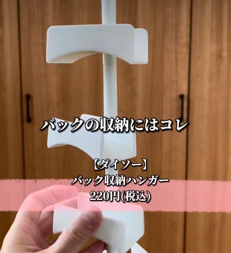 置き場に困るバッグは「バッグ収納ハンガー」(220円)がおすすめ!バッグをかける部分が360度回転するので、重ならずに収納できます。