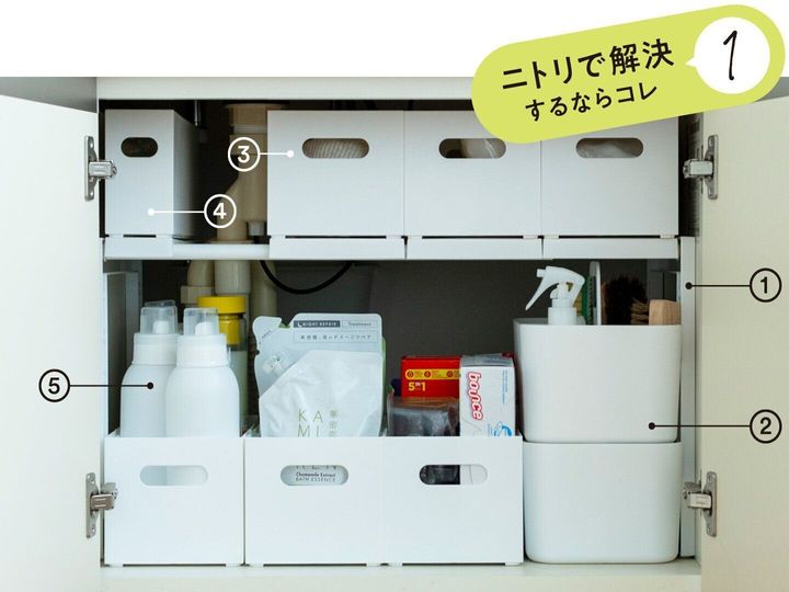 開き戸タイプの収納スペースは、まず棚を設置して上までムダなく収納できるように。入れた物が見やすい低めのケースに、洗剤、ソープ、掃除道具などに分類すれば管理しやすい!