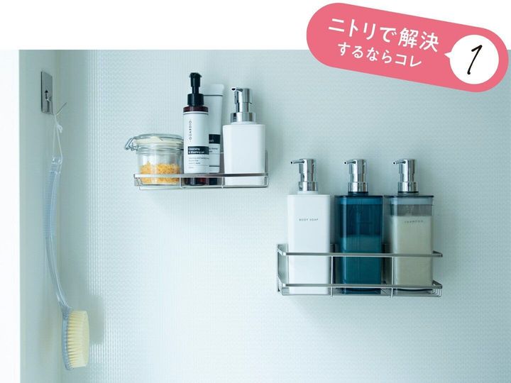 壁面を有効に使うことで、浴室のスッキリ感がUP。ニトリなら、水切れが良くてさびにくく、しかもおしゃれなステンレスの収納グッズが充実。洗練された浴室インテリアに!