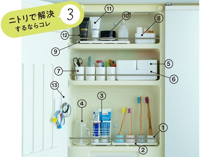 1.「歯ブラシスタンド」(W4×D4×H3㎝)各¥199、2.「トレー」(W19×D7×H1㎝)¥799、3.「カトラリースタンド」(W8×D8×H11㎝)¥499、4.「コップスタンドセット」(W9×D6×H8㎝)¥999、5.「整理トレー(小)」(W9×D9×H5㎝)各¥99、6.「整理トレー(大)」(W17×D9×H5㎝)¥149、7.「小物入れ」(W4×D4×H6㎝)各¥199、8.「整理トレー(小)」、9.「トレー」(W22×D9×H1㎝)¥999、10.「ホワイトニングクリーム」¥999、11.「オールインワンジェル」¥299、12.「薬用リンクルジェル」¥499、13.「フック(2個入り)」