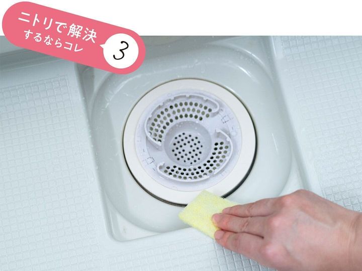 排水口のふたはあえて外す。クエン酸付きの不織布パッドは、キッチン、洗面台などを掃除し、最後に浴室の排水口まで使い倒す!