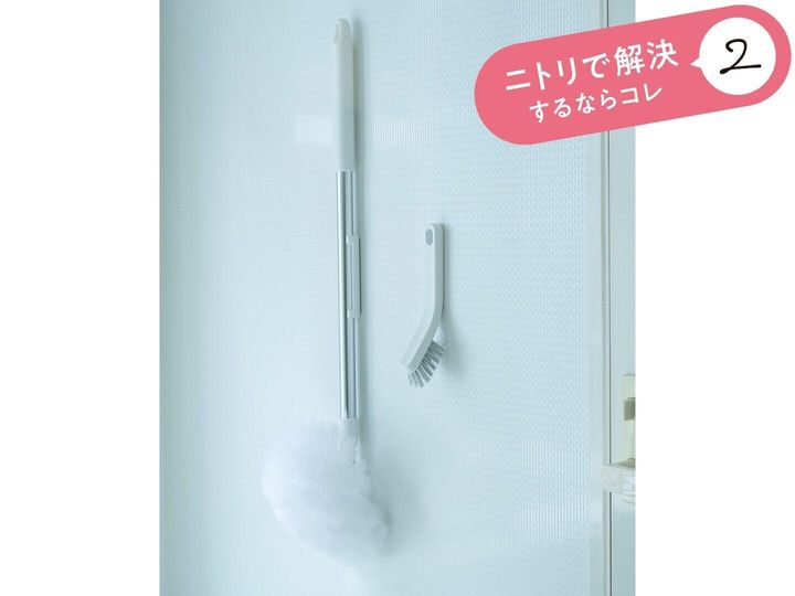 使う場所に使う物を使いやすく収納するのが、キレイが長続きする鉄則。掃除に使うブラシ類は壁面にペタッと貼って収納