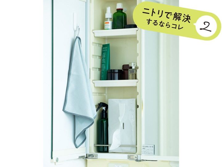 三面鏡の裏はグッズを使えば収納力&スッキリ感が大幅UP。鏡の裏もフックを貼れば立派な収納に!