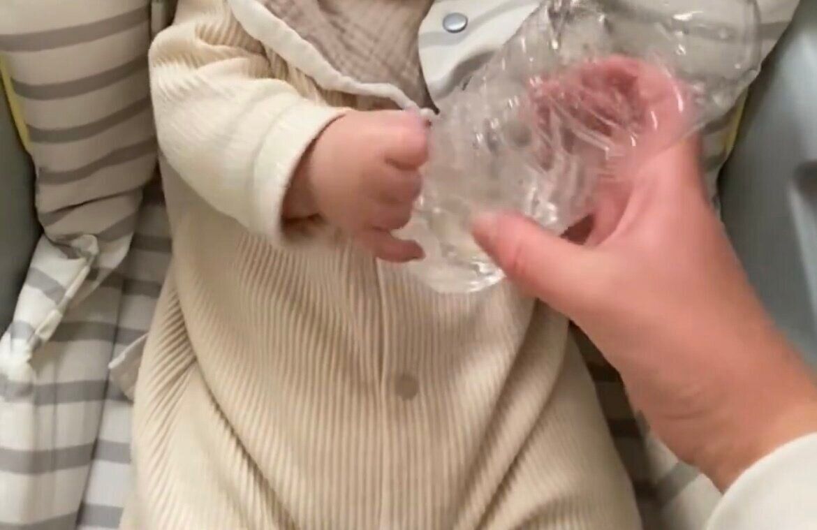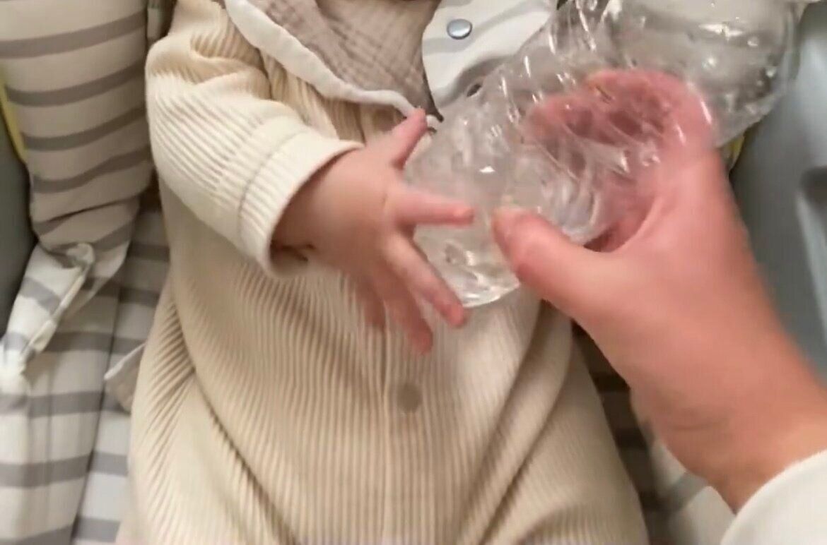 小さな手でペットボトルを掴もうと何度も頑張る姿は、何とも言えない可愛さですね!