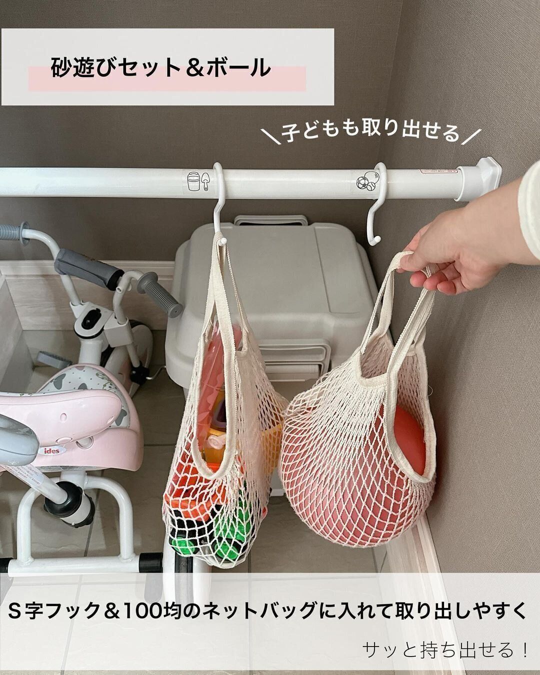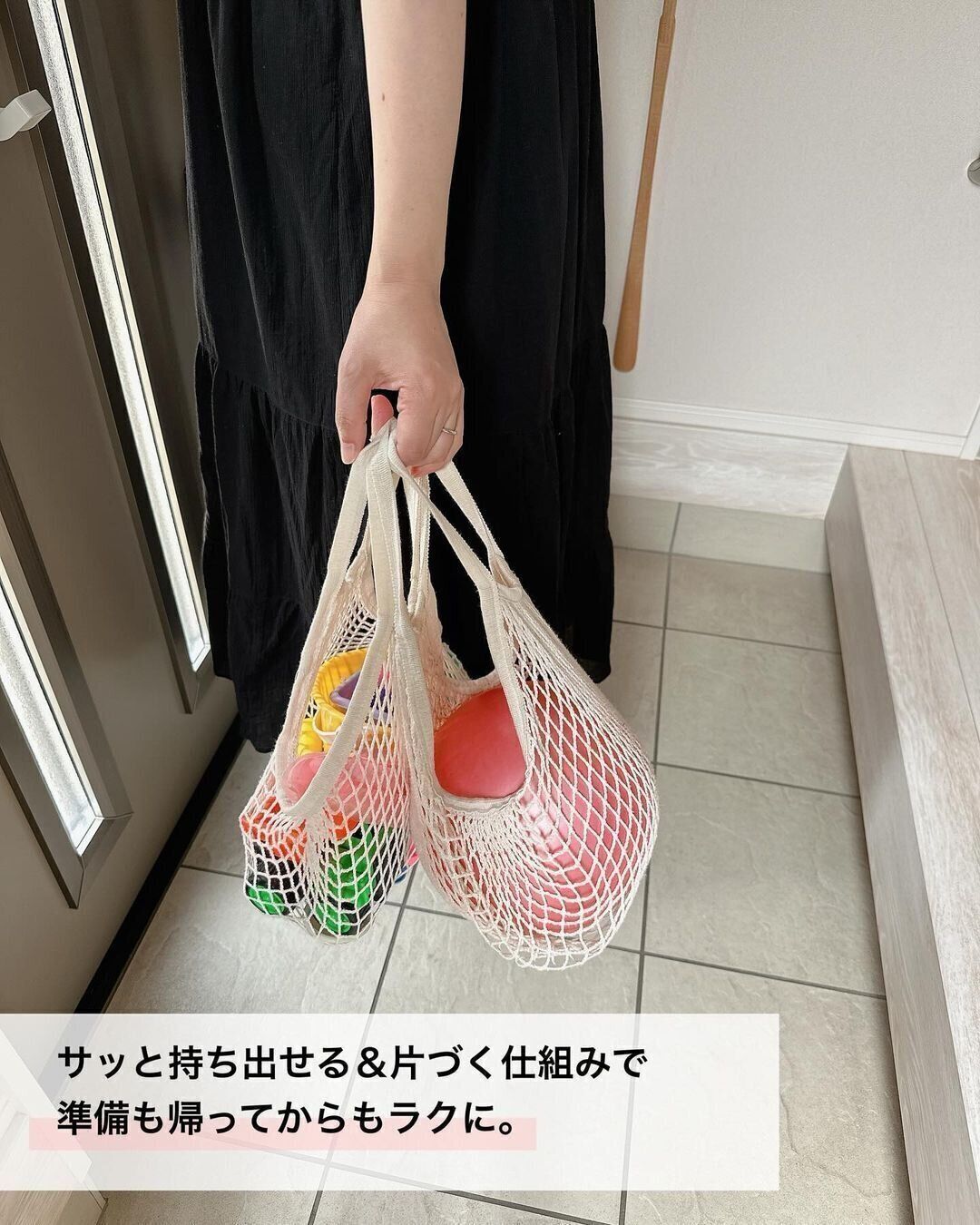 使った後に砂や草など何かと汚れるボールや砂場セットも、このバッグに入れれば持ち運びも楽々。軽くて取手も短いのでお子さんでも持つことができますよ。家に持ち帰った後も、このままかけて収納することもできるのでスッキリ。砂や水がついたものを入れることが多い海に行くときも使えそう。ぬれたものも、このネットバッグなら乾きやすそうです。