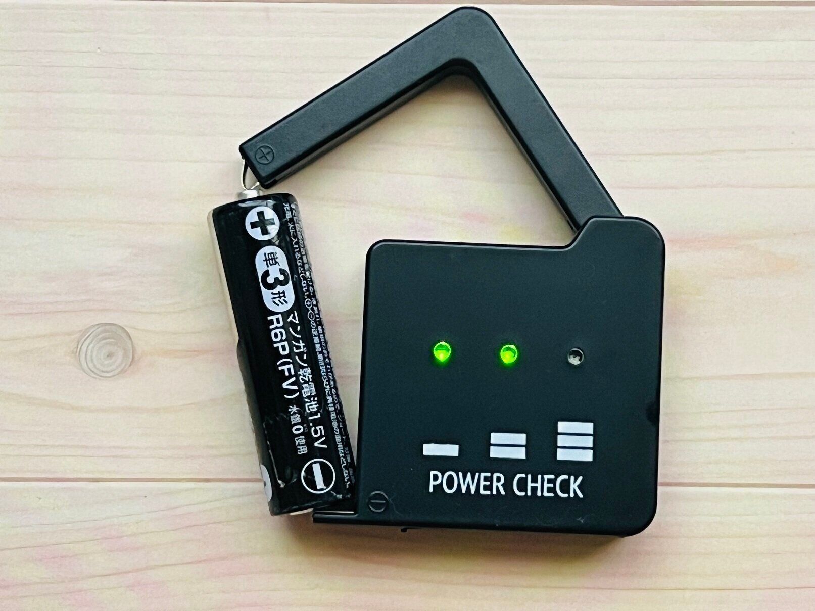 ハンドルを上げて、プラス極とマイナス極を間違わず、はさむだけ!単一から単五までチェックできます。試しに新品の電池を測定したら、ちゃんと3灯しました。