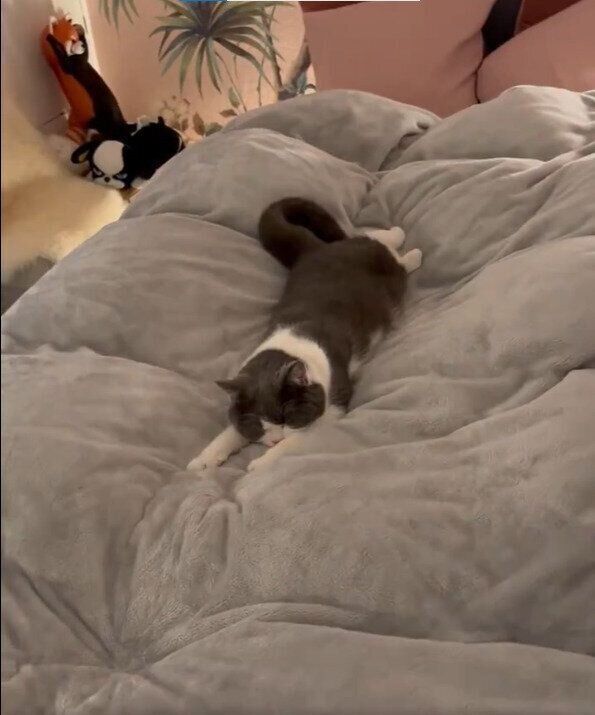 「そろそろ寝ようとベッド見たらこんな状態。今日はソファで寝よう」というコメントの添えられた動画が注目され、多くのいいねを集めました。