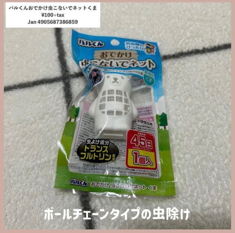 虫が苦手なかたは、このかわいいくまちゃん「バルくんおでかけ虫こないでネットくま」(110円)が虫から守ってくれます。こちらのくまちゃんには、ボールチェーンもついているので鞄などにつけることもできます。見た目もかわいいので、お子さんも喜んでつけてくれそうですね。ほかにも家で窓の近くにぶら下げたり、キャンプやBBQのときに人が集まるところの近くにぶら下げておくのもよさそう。効果期間も45日ですので、1つ買えば長く使えるのもうれしいです。これからの時期に必需品ですので、まだ虫除け関連をお持ちでないかたは、ぜひこちらをお試しください。
