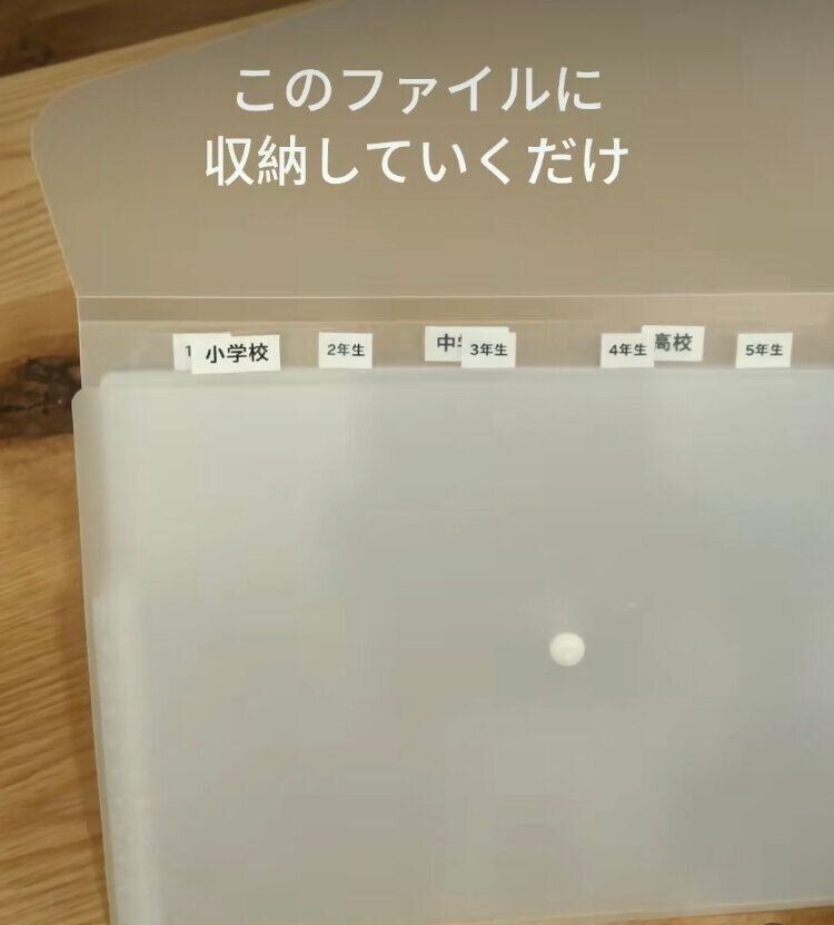 この2つをセットして、見出しの部分にお子さんの学校名や学年を記載すれば、一括で簡単に通知表の管理をすることができます。全学年一緒に保管しておけば、いつでも一緒に見返すこともできて便利。小学生のお子さんがいるご家庭では、すでに過去の通知表をどこに保管したか忘れてしまったというような声も聞くこともあるので、これを作っておけば紛失の心配も無用。通知表以外でも、毎年保管が必要な資料や書類もこの方法で管理してみてください。車内の書類もこのような方法で保管しておくと、必要な書類も取り出しやすくなりますね!