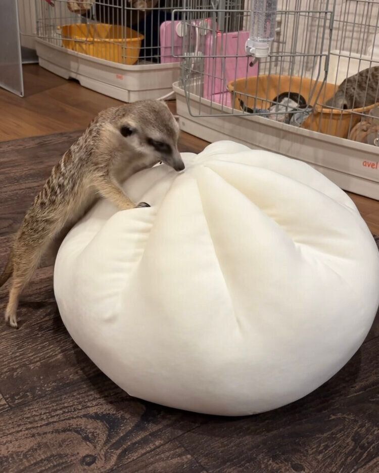 写真を見ると小動物に肉まんをあげているように見えますが、じつはこちらはクッションなんです。もちもち食感が病みつきになるSNSでも話題になった「モチモチクッション ニクマン(NM001)」(1,990円)。見た目もかなりインパクトがありますが、食感までも肉まんに寄せているとなると実物をさわってみたくなりますよね。どうやら、ミーアキャットも気に入ったようです。お子さんウケもしそうな巨大肉まん。ぜひ店頭でチェックしてみてください。