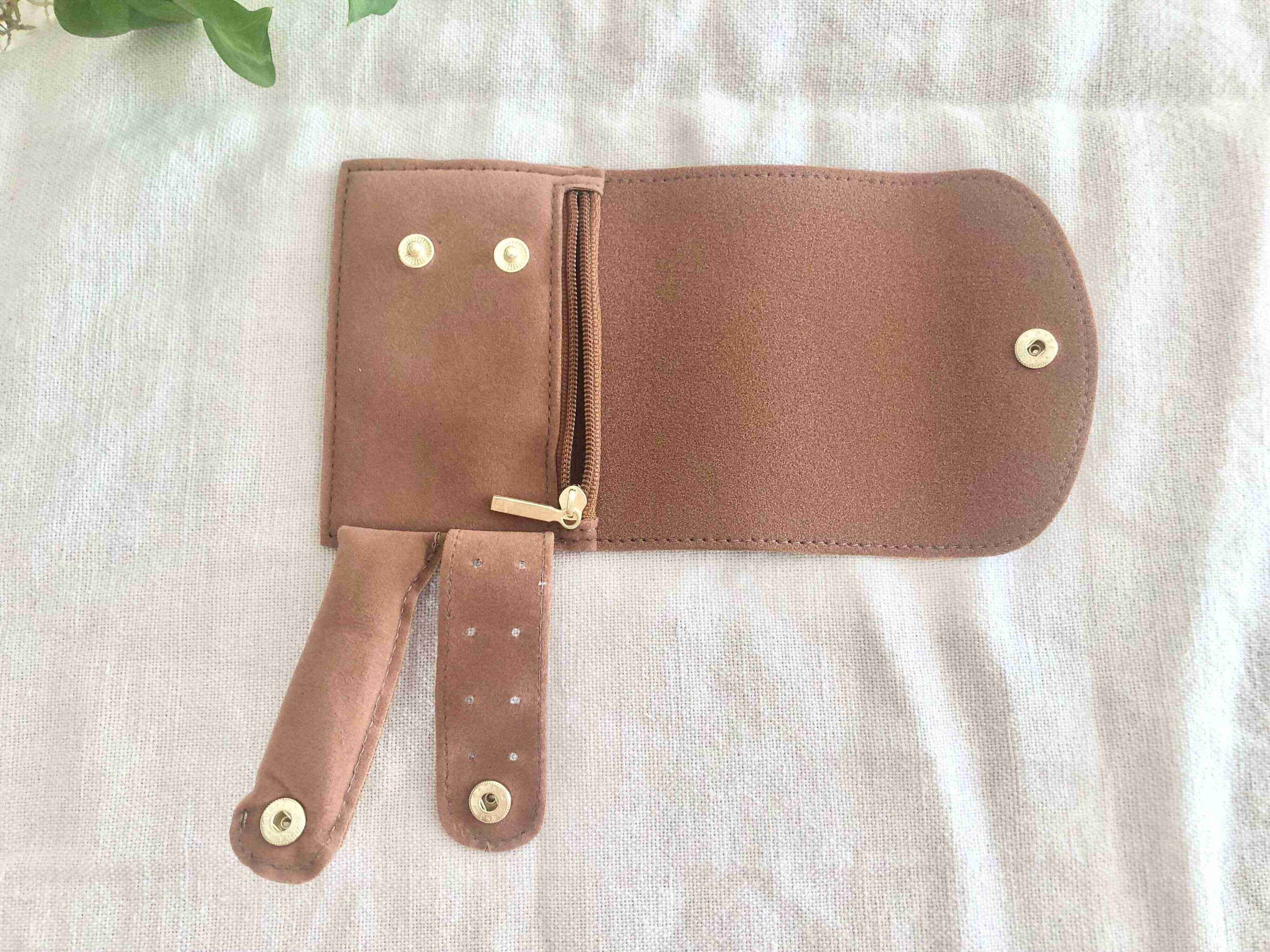 見た目はまるでカードケースのようですが、ボタンを外して開けてみると中はまったくの別物!異なる2本のベルトと、ファスナーつきのポケットがあります。