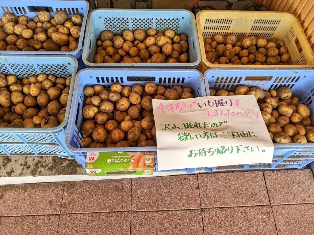 という張り紙とともに、6つのケースに積まれたたくさんのジャガイモ。
