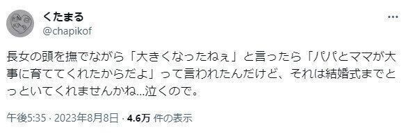 この言葉を聞いたくたまるさんは「結婚式まで取っておいてくれませんかね…泣くので」と思ったのだそう。
