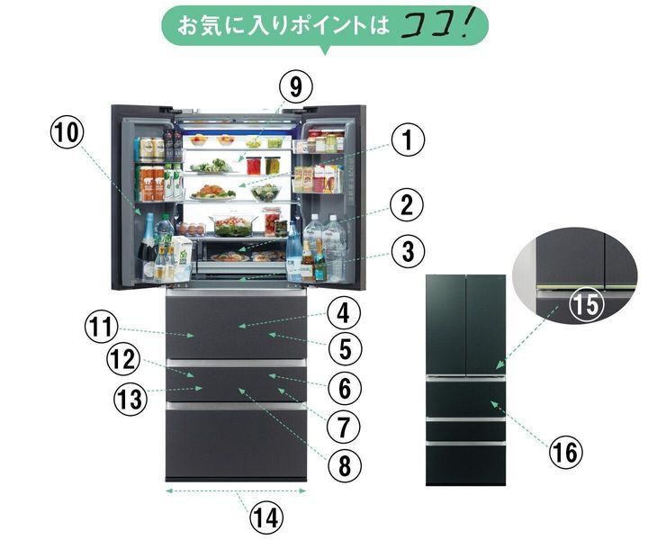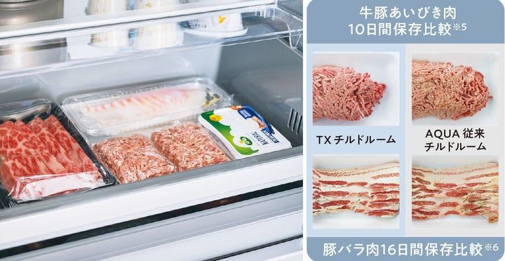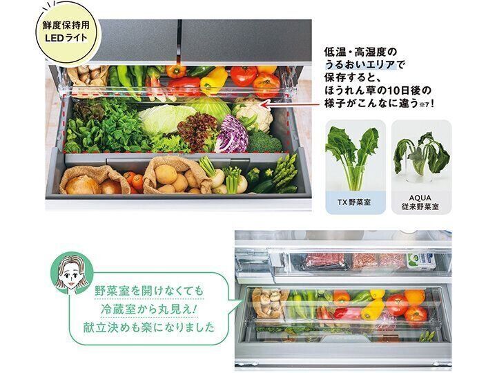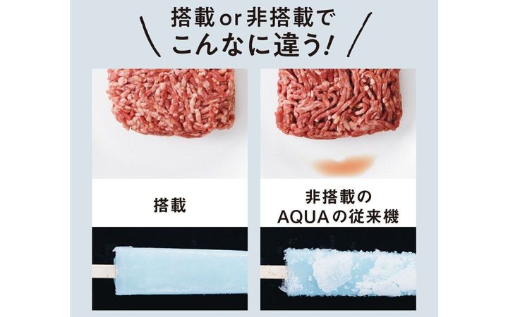 ※1:浮遊菌除菌効果/試験の方法:200ℓのボックス内にオゾンを放出し、その後に浮遊菌(黄色ぶどう球菌)をエアーサンプラーを用いて採取し、生菌数を測定。/試験結果:約60分で除去率99% ※2:付着菌除菌効果/試験の方法:200ℓのボックス内に菌(黄色ぶどう球菌)を塗布した寒天培地を配置しオゾン放出6時間後の生菌数を測定。/試験結果:360分で除去率99%(※1・2いずれも実使用空間での実証結果ではありません/試験依頼先:(一財)北里環境科学センター) ※3:形状によっては収納できない場合があります。※4:食材の発芽を抑制することを目的とした鮮度保持について。1980年1月~2023年4月国内で発売された国内家庭用ノンフロン冷凍冷蔵庫のカタログより調査。アクア調べ。 ※5・※6:試験条件/AQR-TX51NとAQR-SV38K(2021年モデル)のチルドルーム(微凍モード)において、牛豚あいびき肉は10日間、豚バラ肉は16日間、それぞれパックのまま保存。(一財)日本食品分析センター調べ ※7:試験条件/AQR-TX51NとAQR-SV38K(2021年モデル)の野菜室において、約1.8kgのほうれん草をラップなし、ドア開閉なし、ツインLEDオフで10日間保存。アクア調べ。※8:60℃の食品まで対応可能。熱いものをクイック冷凍する場合は消費電力が約30%程度上がります。食品の間は約3cm以上離してください。※9:特許5832937:凹形状のカバーでファンを覆うことにより、除霜時の温度上昇を防ぐ。 ※10・11:試験条件/おいシールド冷凍が搭載されたAQR-TZA51Nと非搭載のAQR-SV38J(2020年モデル)の冷凍室において、ひき肉120gをパックのまま2週間、アイスキャンディーをパッケージ未開封のまま4週間保存。アクア調べ。※12:ユーロモニター・インターナショナル「GlobalMajor Appliances 2022 Brandランキング」の調査結果を受けて。