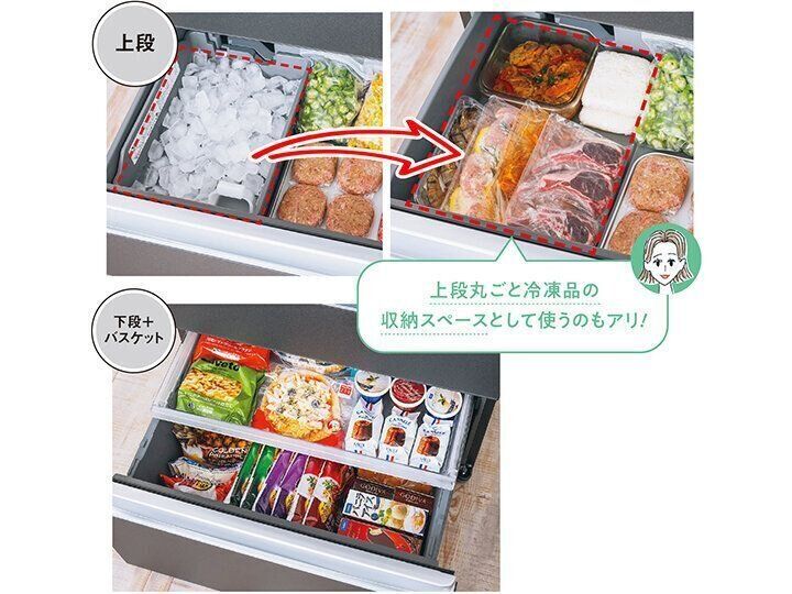 上・下段(+バスケット)で合計140ℓ! 見落としがちなアイストレイの汚れも、取り外して丸洗いできるから衛生的です
