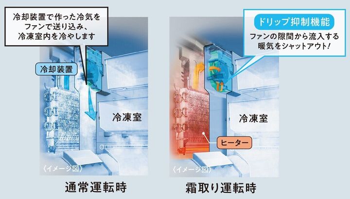 食材に直接冷気を当てず、上面のアルミパネルと下面のアルミトレイで食材を包み込むように冷やす「W間接冷却チルド」。保存する食材に合わせて【通常(約0~2℃)】と【微凍(約−3~−1℃)】のモードを選べます