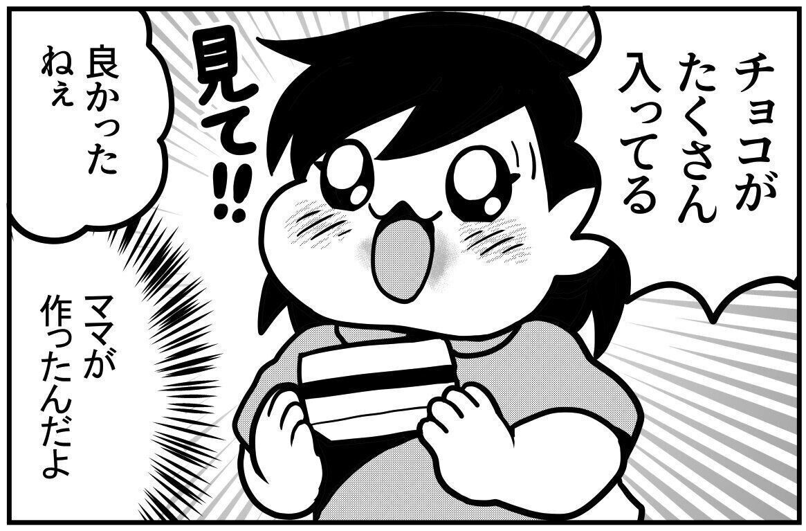 キラキラした表情で「チョコがたくさん入っている!」と感動を伝えてくれる娘に、「良かったねぇ」と返すきくまきさんですが、心の中で「ママが作ったんだよ」と突っ込まざるを得ないのでした。